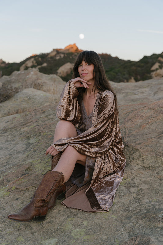 Our soul purpose is to create from the depths of our heart while honoring the circle of life. Each piece begins with natural fibers, ethically sourced and hand-dyed in Topanga Canyon. More than clothing, these offerings carry the story of sustainability, artistry, and spirit—woven together in harmony with nature.