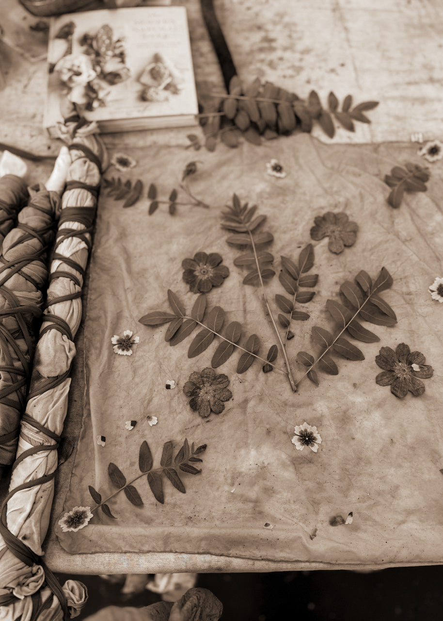 Botanicals are carefully arranged on the fabric, then wrapped or pressed so their pigments release and imprint directly onto the fibers. Each flower and leaf leaves behind its own delicate mark, forming organic patterns that cannot be replicated.