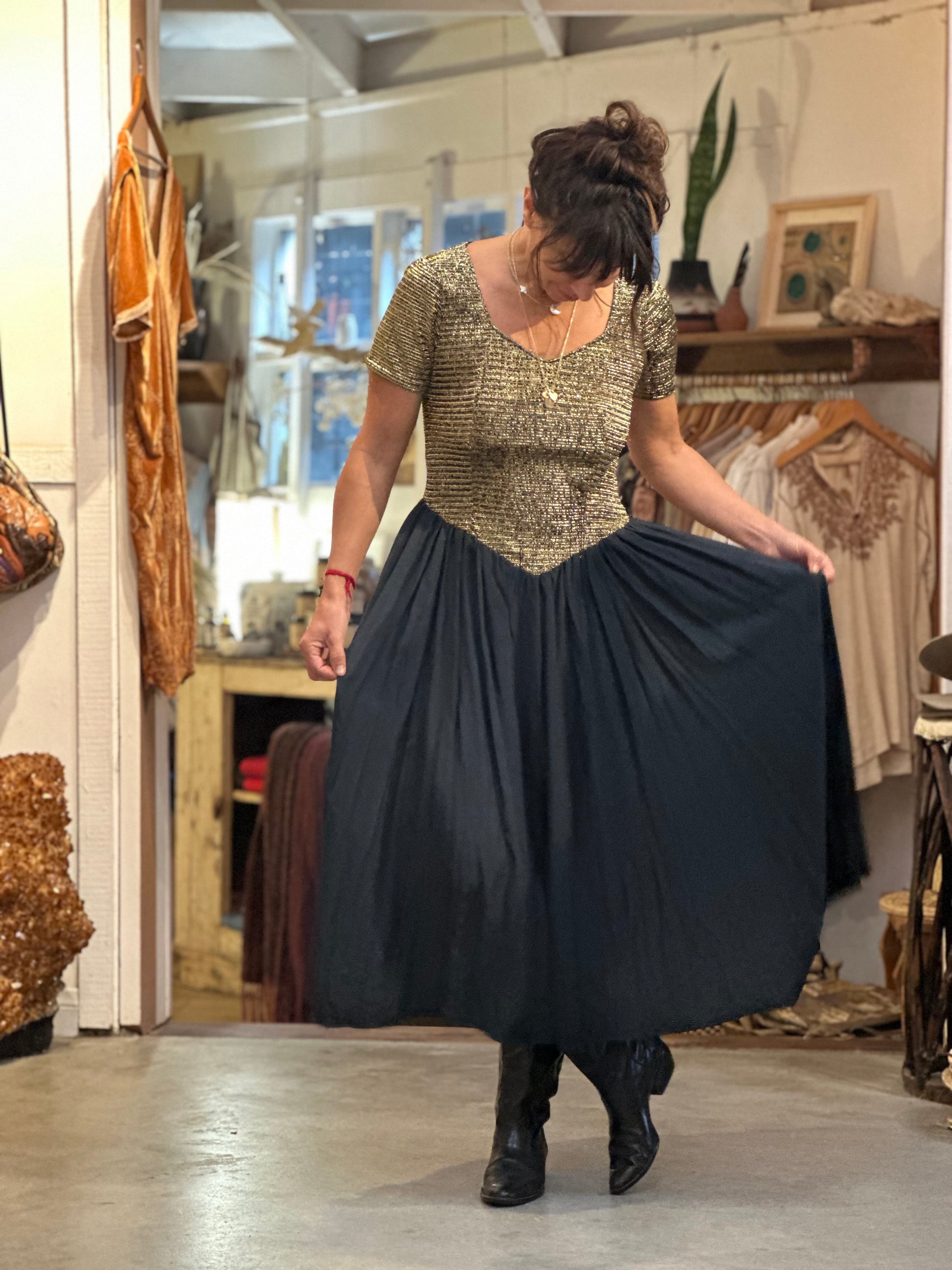 A glamorous piece of 1980s evening wear, this cocktail dress perfectly captures the decade’s love for dramatic embellishment and sophisticated silhouettes. The striking contrast between the shimmering gold lamé bodice and flowing black skirt creates an effortlessly elegant look that transitions seamlessly from cocktail hour to dance floor.