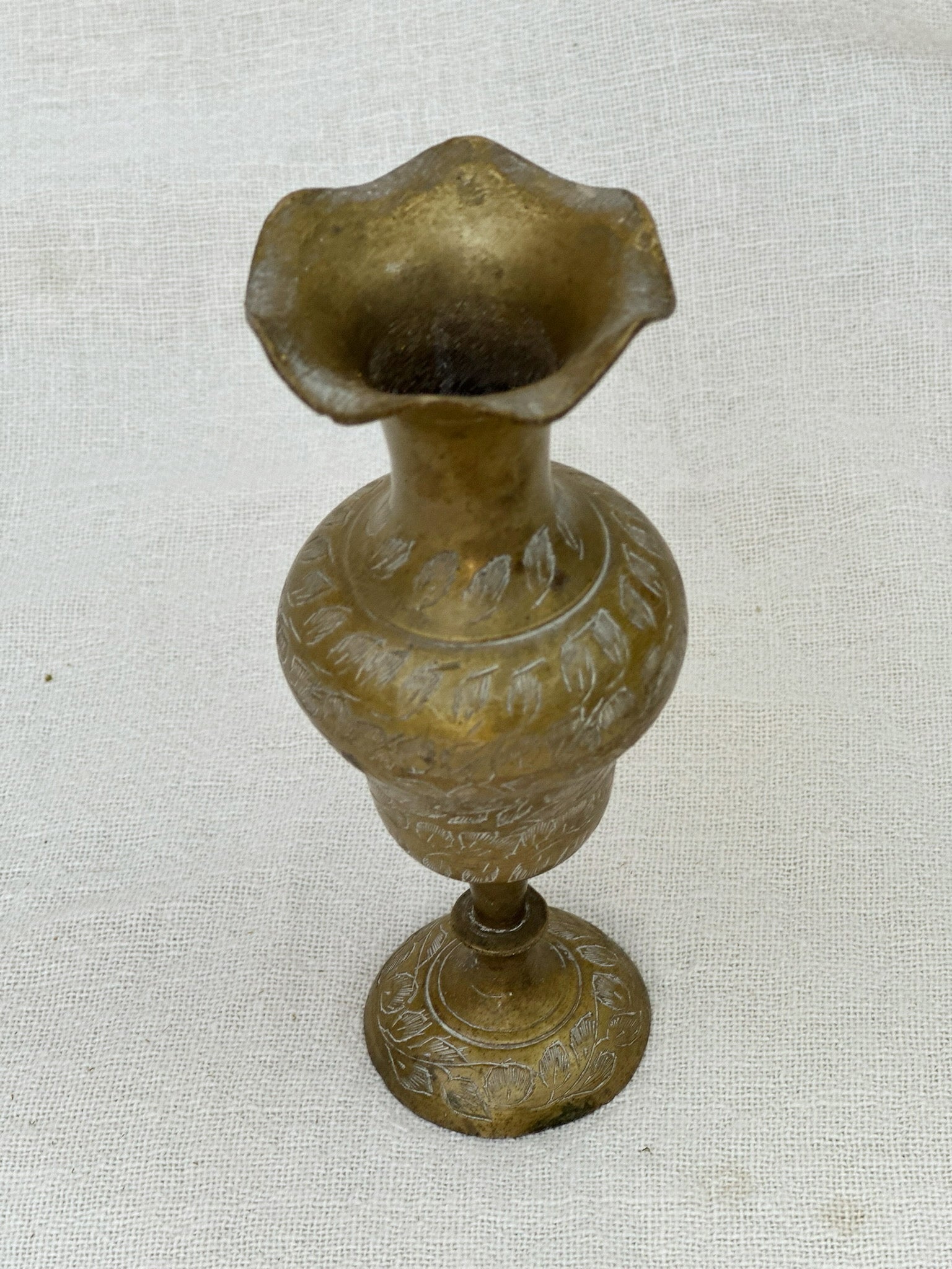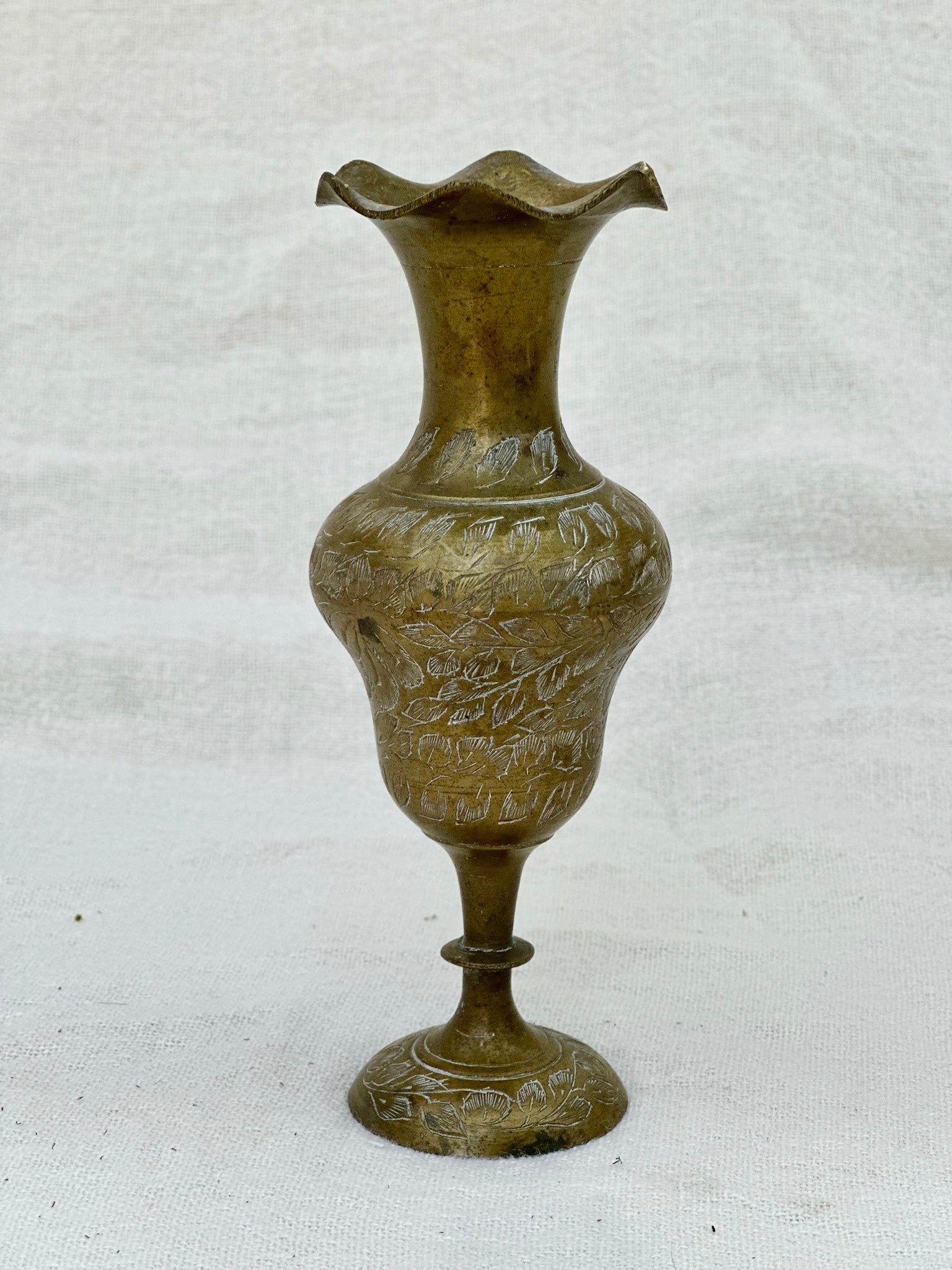This elegant antique-style brass vase features a sophisticated silhouette with beautiful decorative details throughout. The vase showcases a gracefully fluted rim that opens to a slender neck, flowing into a bulbous body adorned with intricate embossed patterns. The ornamental design continues down to a sturdy pedestal base, giving the piece a refined, classical presence.