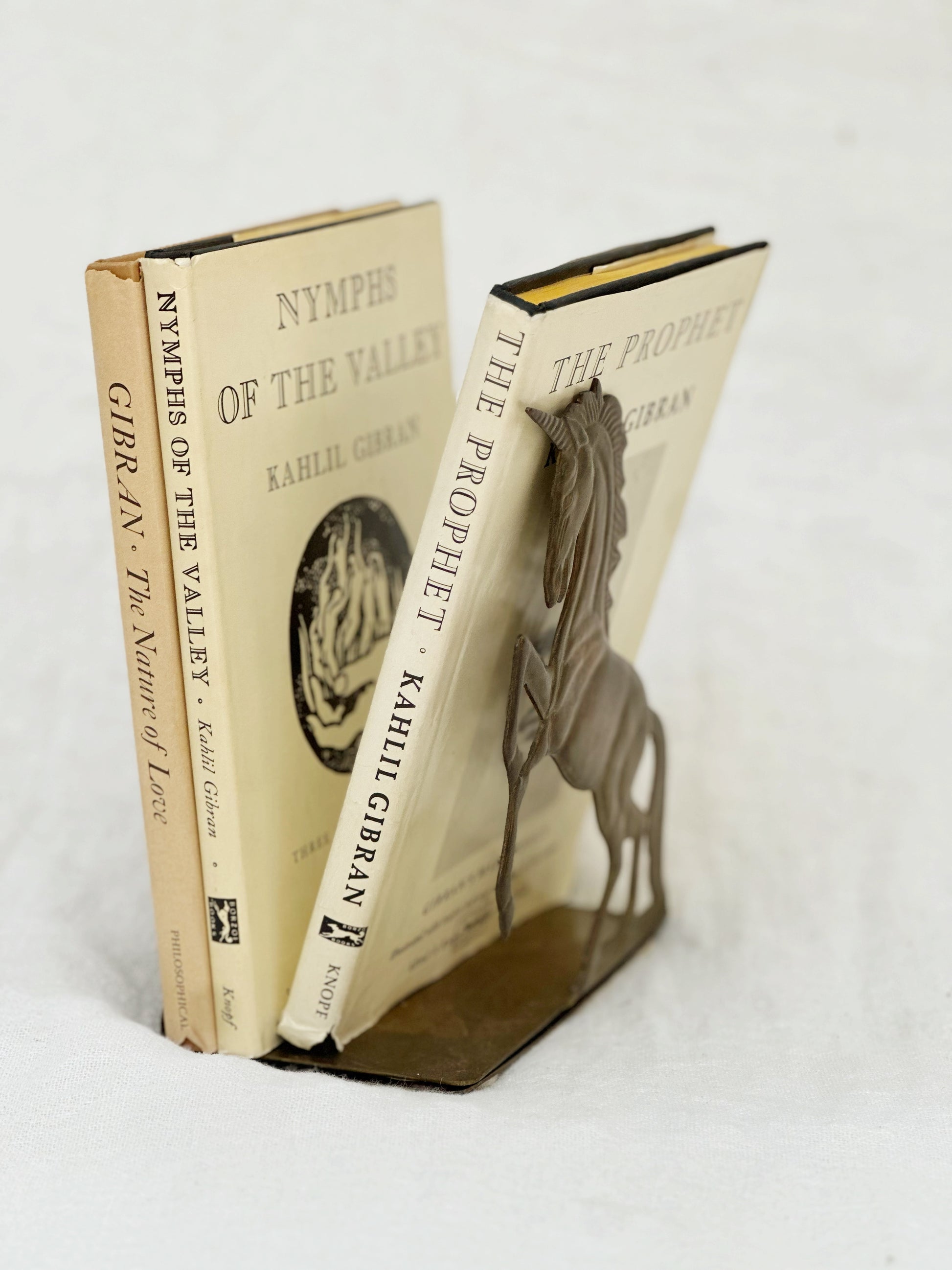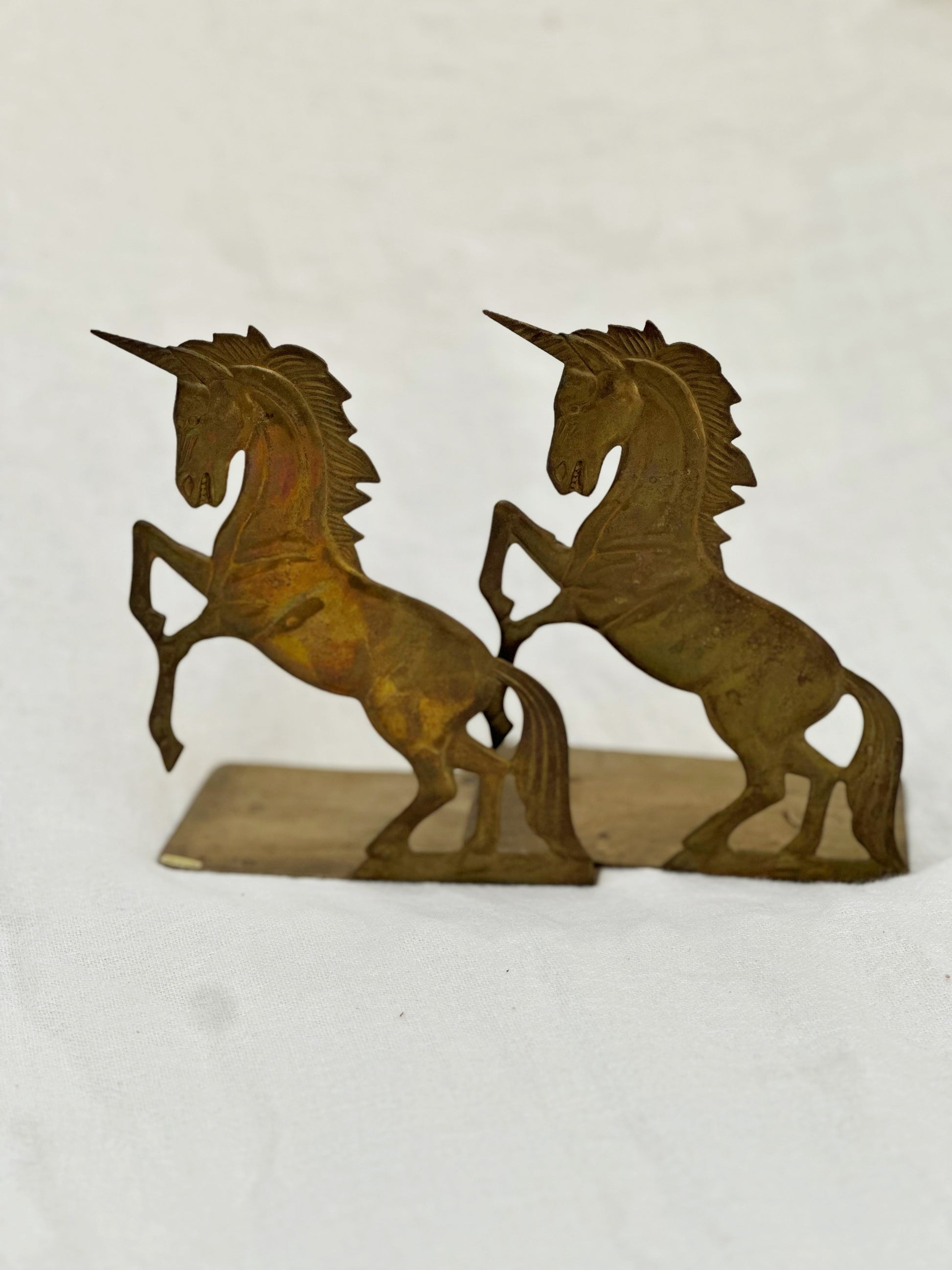 Transport your favorite stories to a realm of wonder with this captivating pair of vintage brass unicorn bookends. Each majestic creature rises in eternal grace, their spiraled horns reaching toward dreams while their powerful forms guard your most treasured tales.