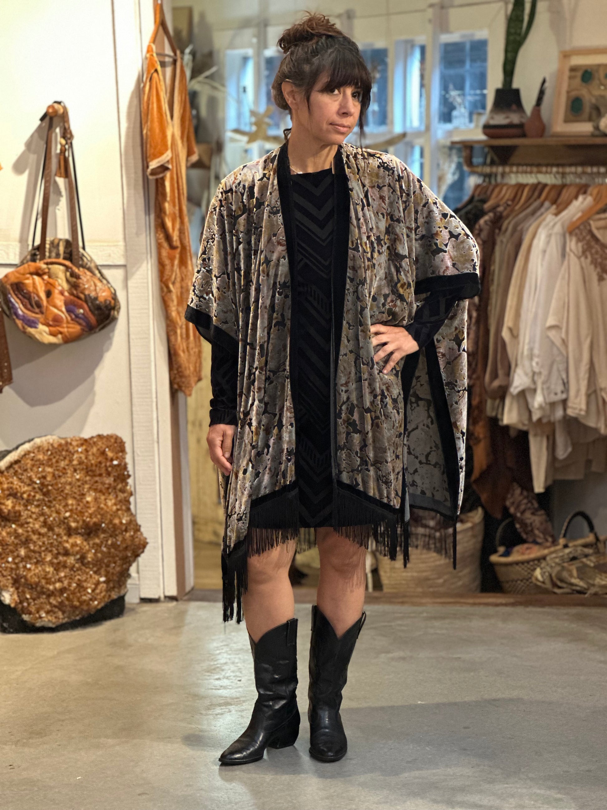 The burnout velvet technique creates beautiful depth and dimension, with the opaque velvet flowers contrasting against the translucent background for a subtly revealing yet elegant effect. The long black fringe adds a touch of bohemian drama that sways beautifully with every movement.