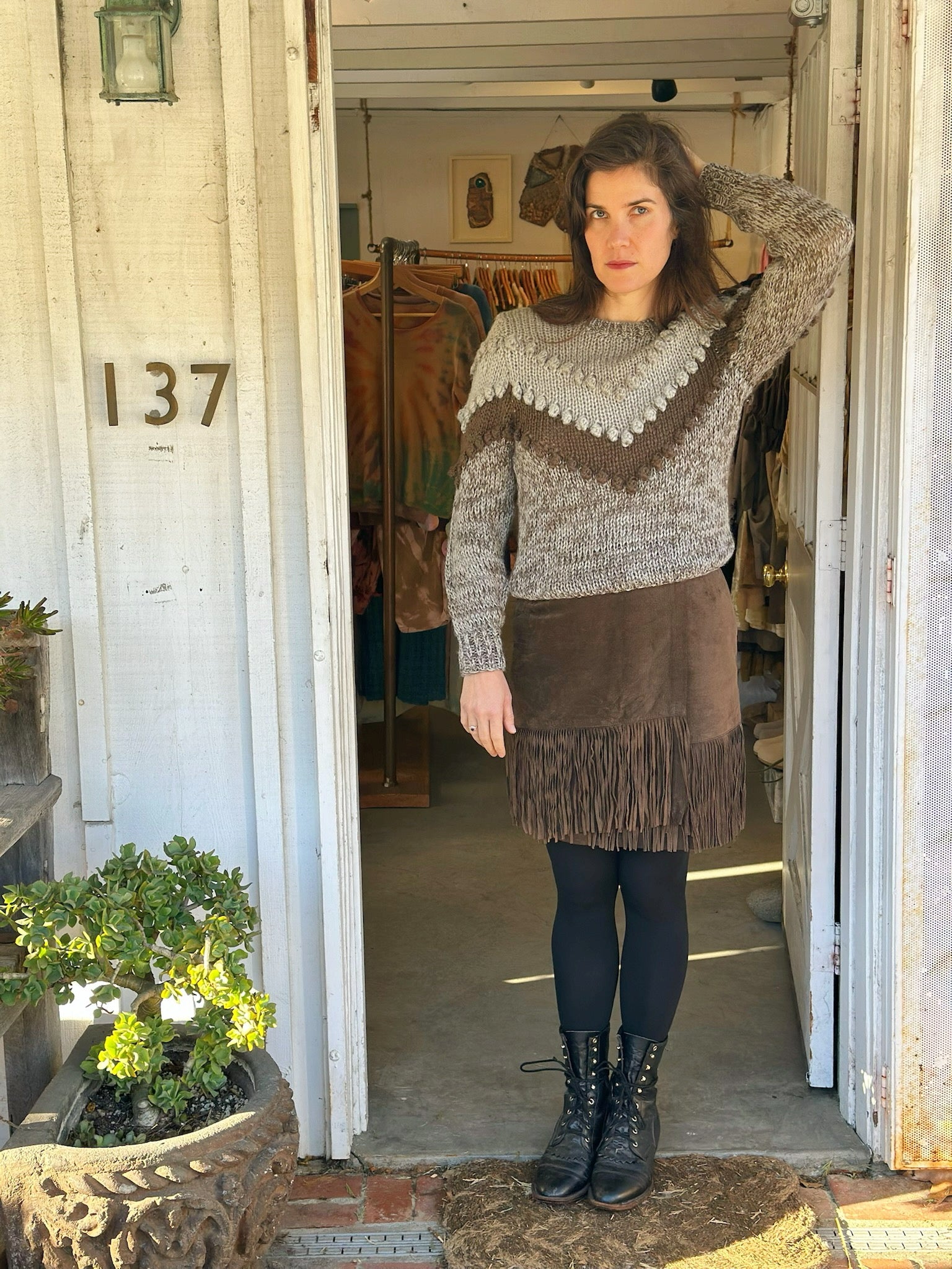 Pure 1970s ski lodge/cottage core charm. The folk art-inspired pompom detailing and earthy colorway give it a handcrafted, appeal. Perfect for cozy autumn and winter styling with jeans,or skirt.