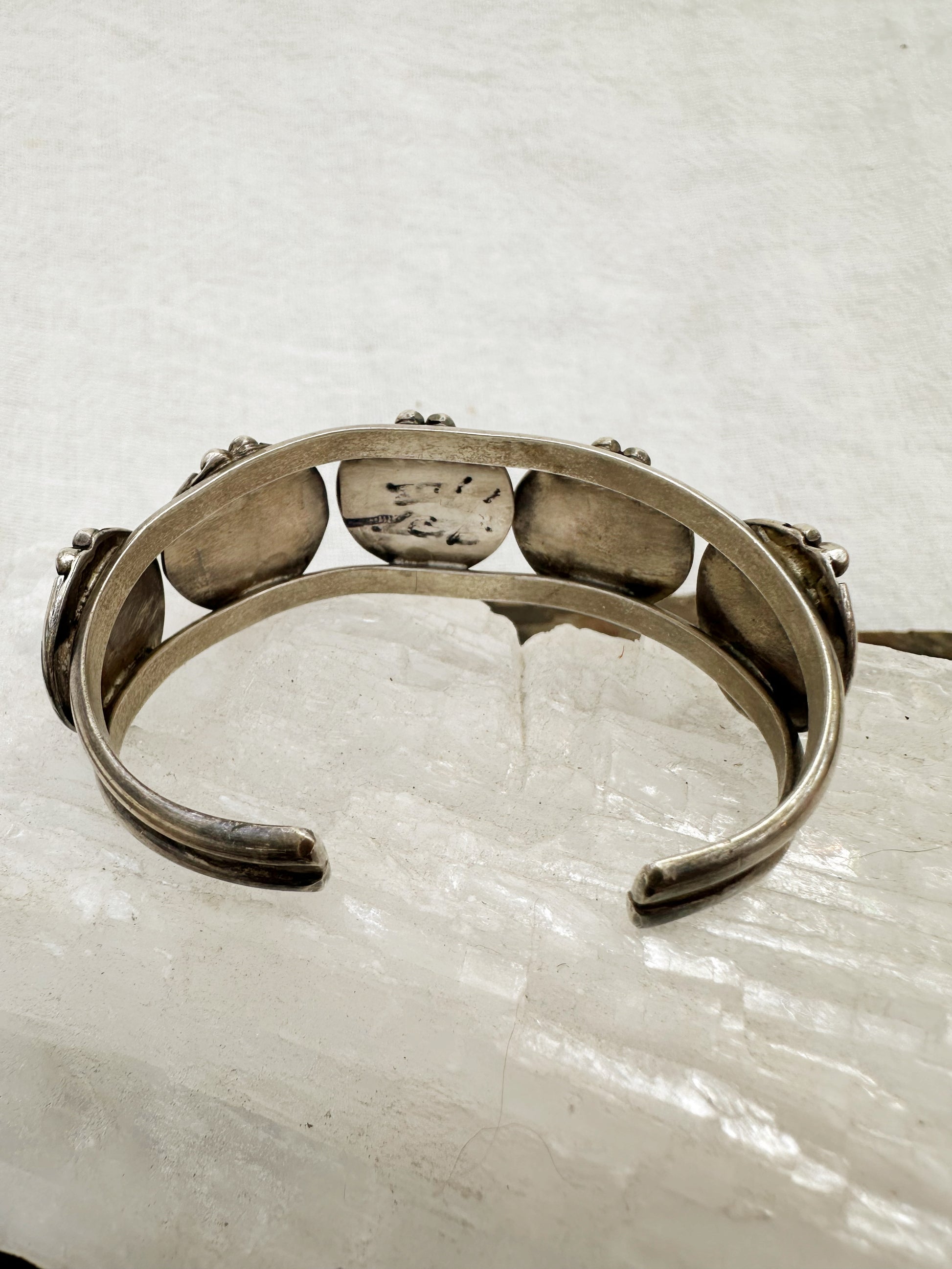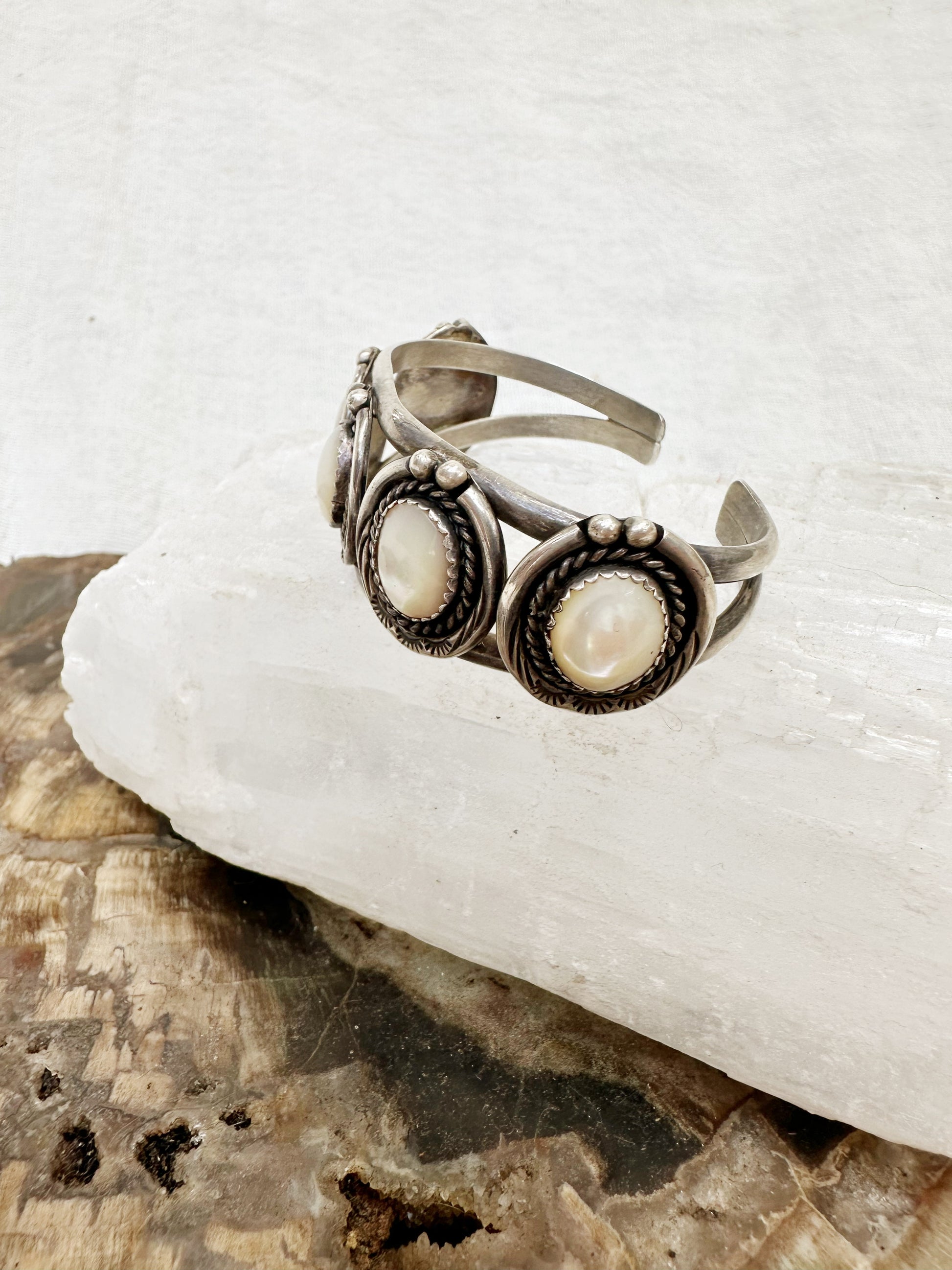 This exquisite vintage cuff bracelet showcases the finest traditions of Native American silversmithing, featuring three lustrous mother of pearl cabochons set in elaborate sterling silver bezels. Each iridescent stone seems to capture moonlight, creating an ethereal glow against the richly oxidized silver.